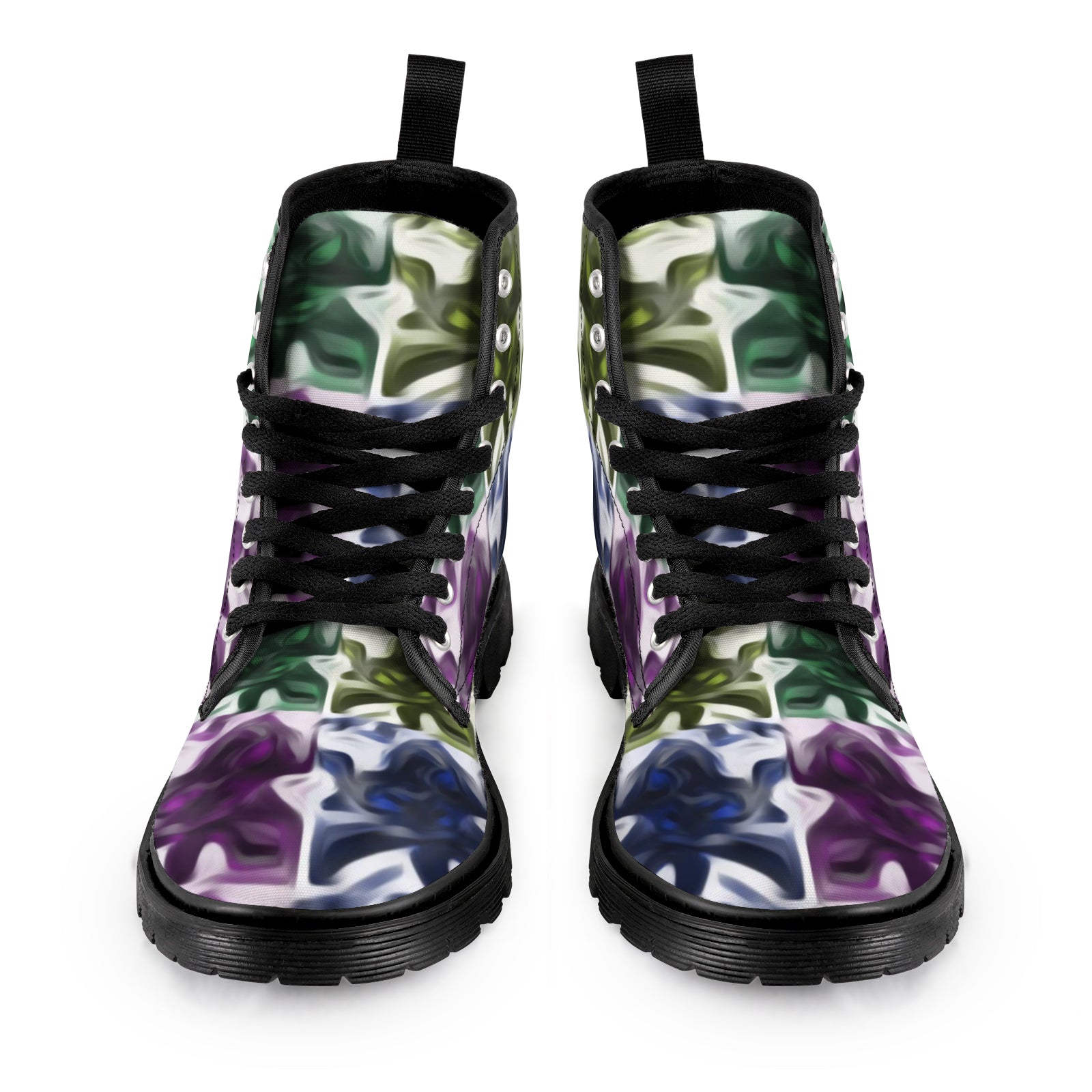 Introducing the Prism Camo Men's Lace-Up Canvas Boots — a high-performance, head-turning boot built for both comfort and street-ready style. With a vibrant all-over abstract camo print in purple, green, navy, and white, these boots are your go-to for bold everyday wear or off-road adventure.