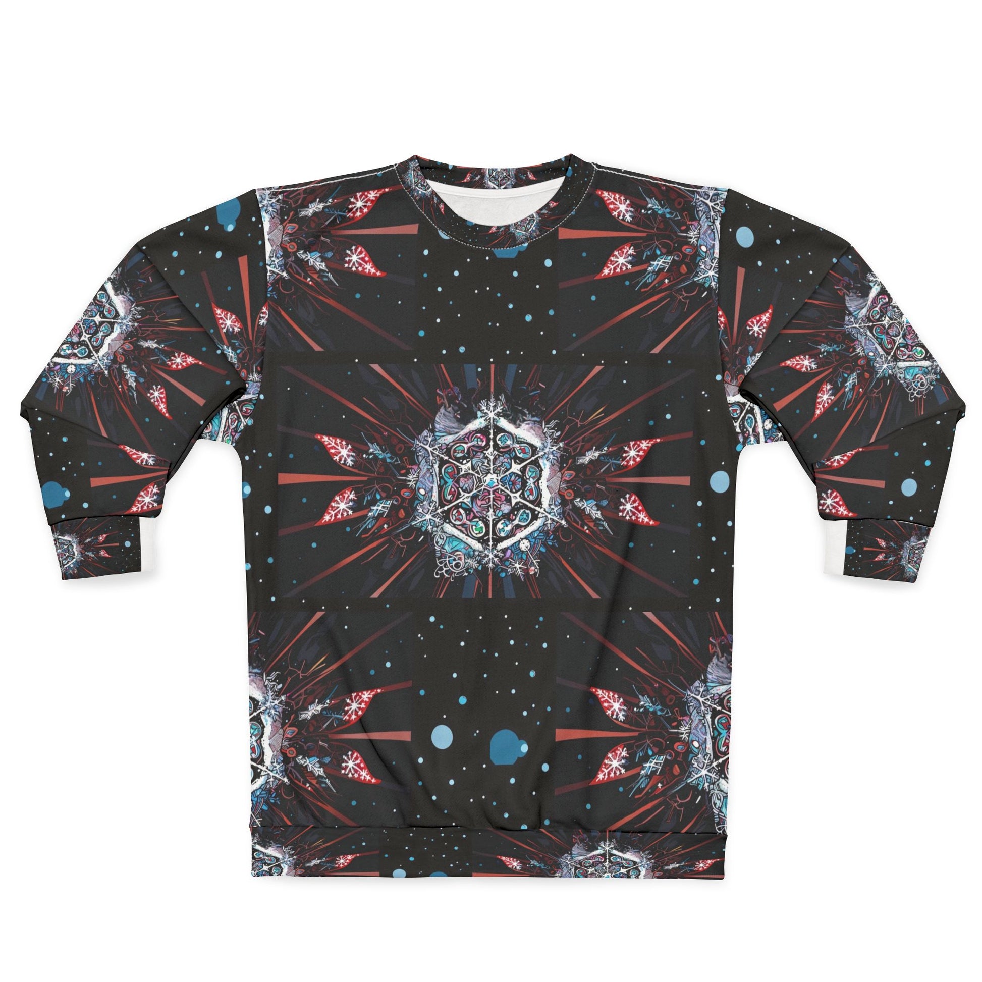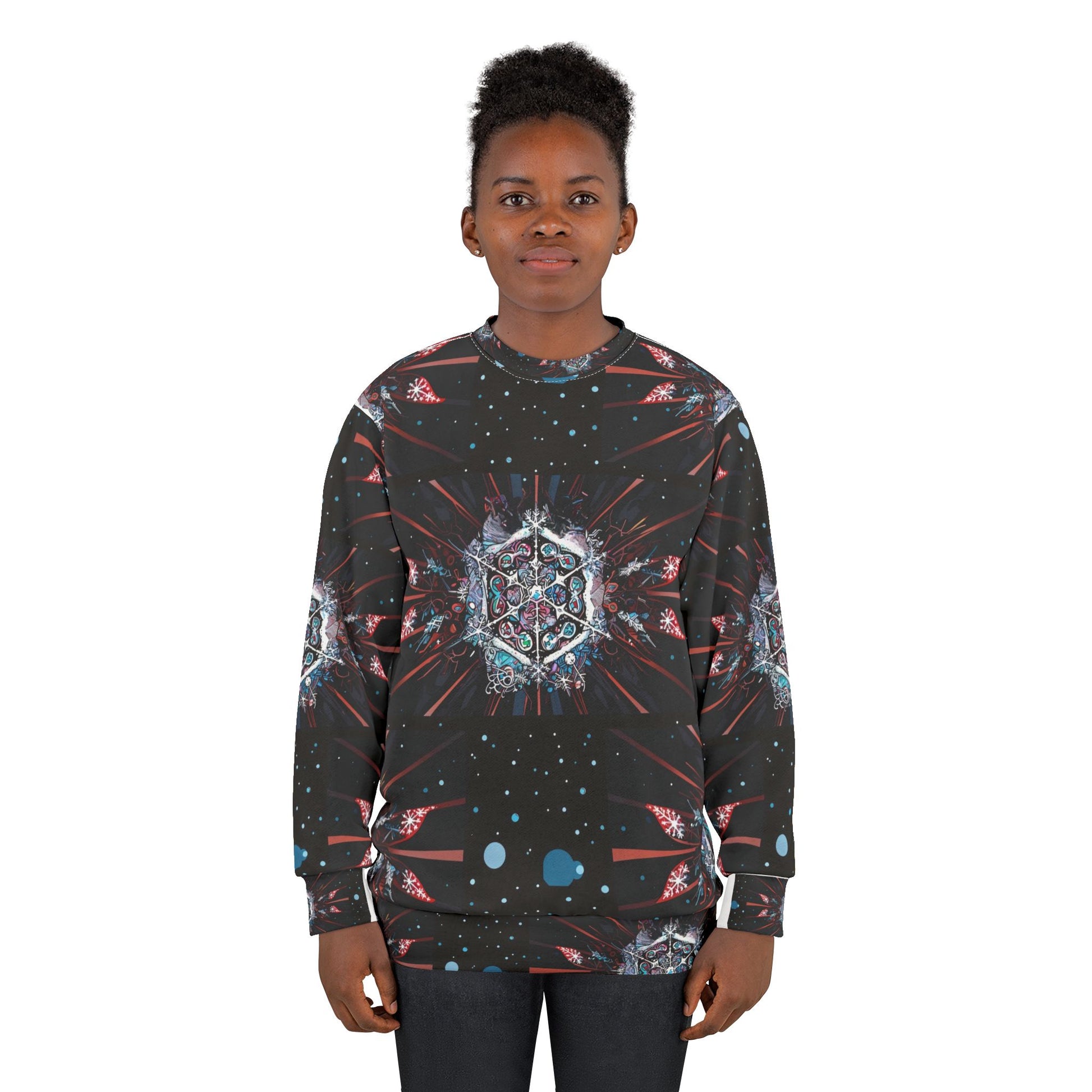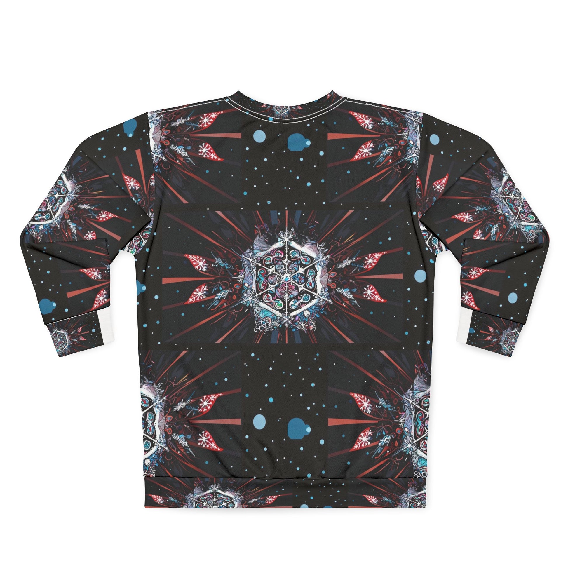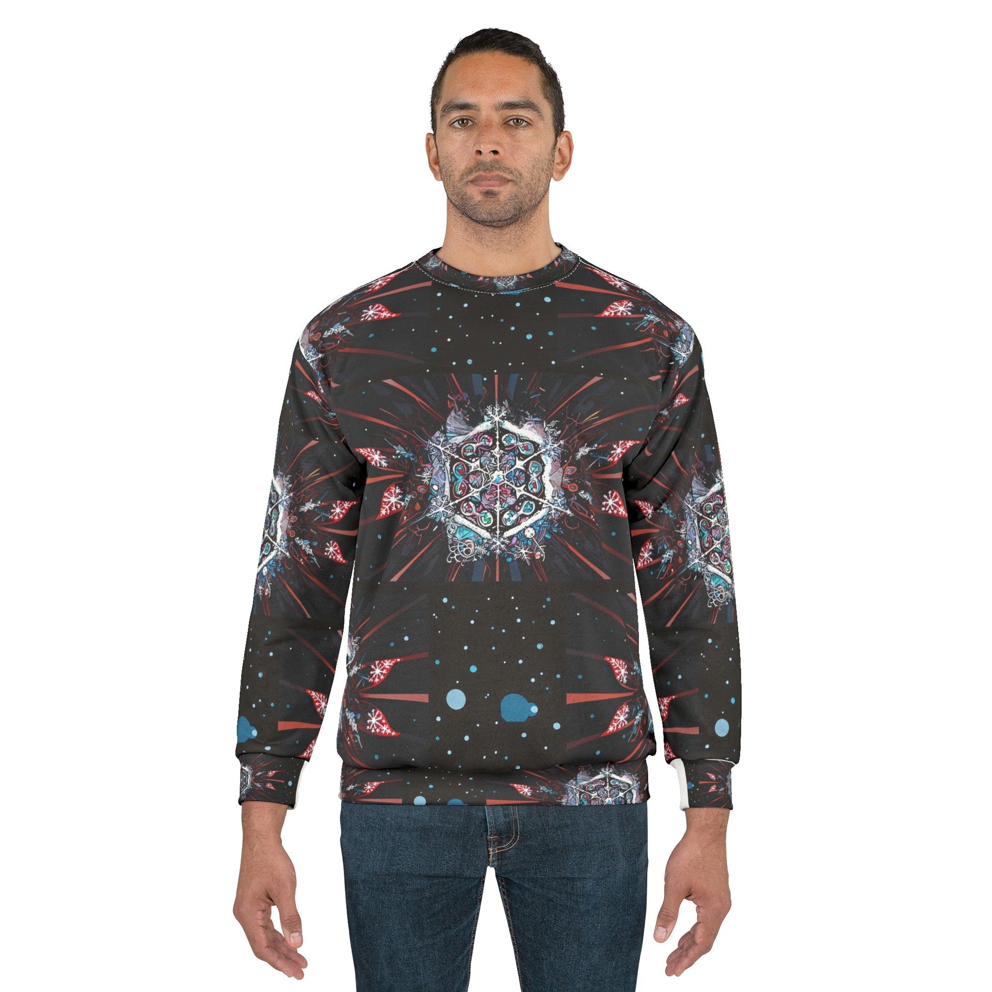 Embrace the festive season with the Galactic Holiday Joy Crewneck Sweatshirt, designed to inspire warmth, happiness, and a cosmic sense of wonder. Featuring a mesmerizing all-over print with intricate kaleidoscopic patterns and celestial motifs, this sweatshirt is perfect for spreading cheer while staying stylish.