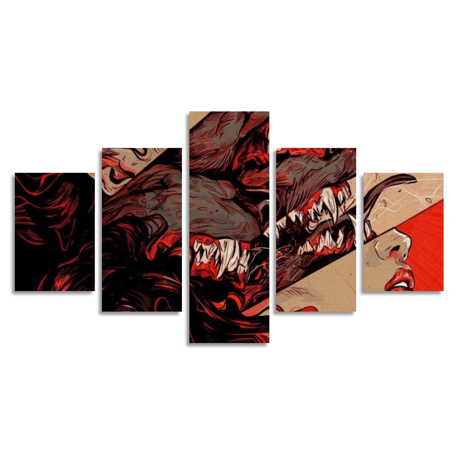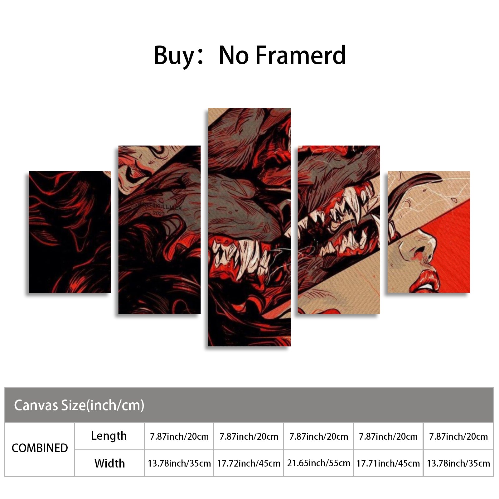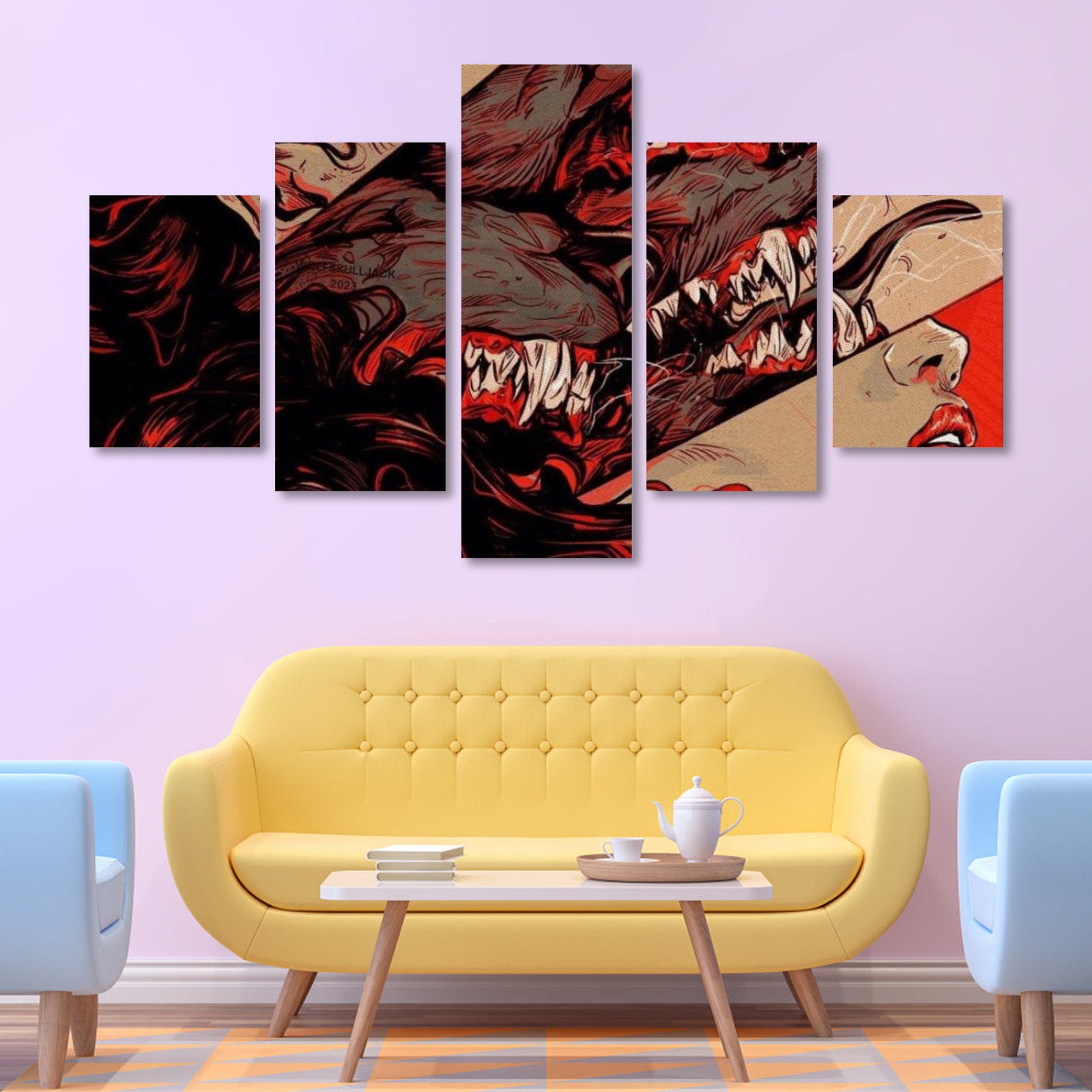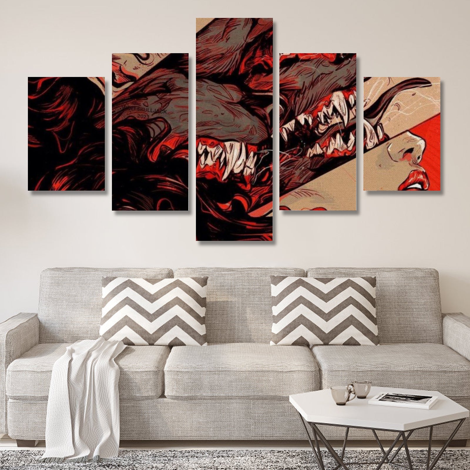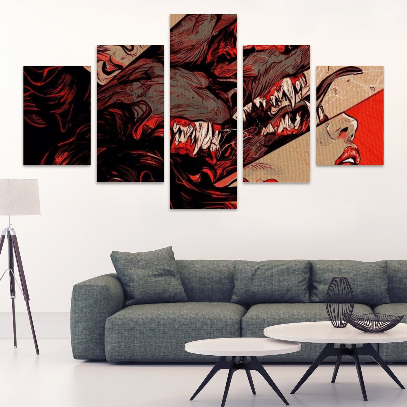 "Enhance your space with the intriguing depths of 'Vision of Fury,' a canvas wall art set that captures a mesmerizing contrast between calm beauty and raw intensity. This 5-piece set, printed on high-quality canvas, is designed to add a dramatic touch to your home or office decor. Each piece, depicting a woman entwined with a fierce beast in striking red tones, is ready for framing and can be arranged to suit any room’s ambiance. Ideal for various spaces including living rooms, bedrooms, or offices, this set also makes a thoughtful gift for special occasions, offering a blend of elegance and spirited expression. Carefully crafted, each segment is a testament to durability and artful allure, ensuring that the essence of passion and power is communicated without the need for words."